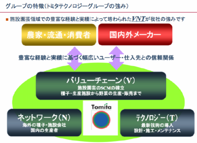 トミタテクノロジー株式会社が中心となった農業ビジネスネットワークとその総合力で、調査、技術の導入、計画、施工、販売、運営生産支援までを行っています。