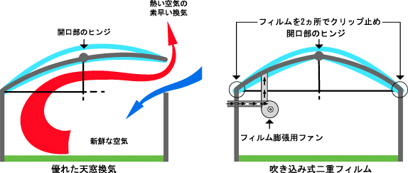屋根被覆は、吹き込み式の二重フィルムなので保温性が高く、風や雪に強い構造となっております。