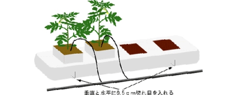 ●定植1週間後、排液が完全に抜けているのかをチェックします。もし、養液がたまるなら更に排液のためのスリットを作ります。